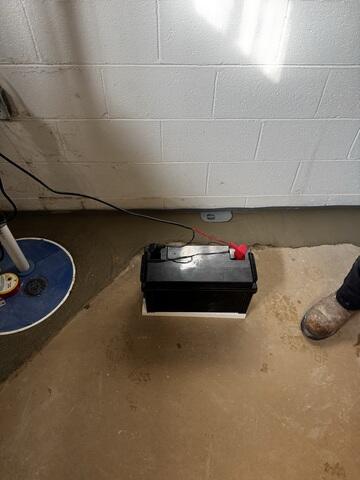 A SuperSump system was added, featuring a cast iron pump, airtight lid with floor drain, CleanPump stand, WaterWatch alarm, IceGuard, LawnScape outlet, and a 15' exterior discharge line. For added protection, an UltraSump battery backup system was included to ensure continued operation during power outages.