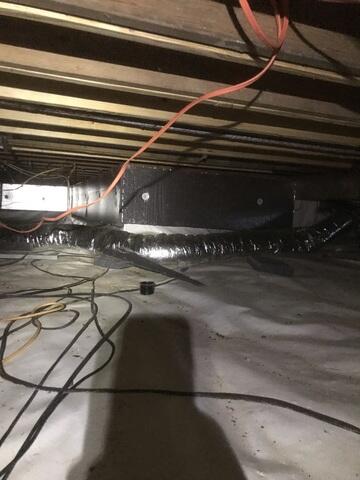 Foreman Joe and his crew began by removing all fiberglass insulation from the crawl space to prepare for installation. They then installed the CleanSpace Encapsulation System, sealing off ground moisture and improving air quality. To maintain low humidity, a SaniDry Sedona dehumidifier was added, supported by new electrical outlets for safe operation.